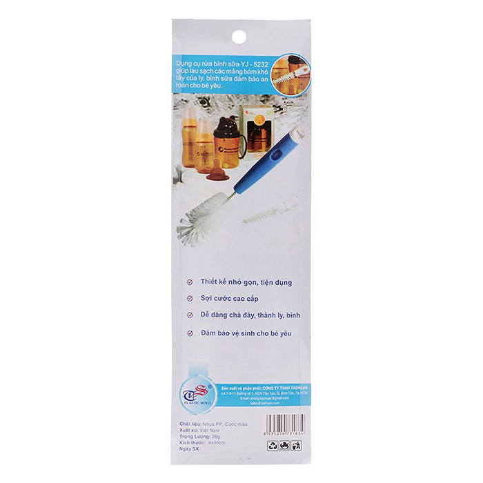 Dụng Cụ Vệ Sinh Bình Sữa Tashuan TS-5232 có phần đầu cọ được làm từ sợi nylon mềm, độ đàn hồi tốt, giúp cọ sạch bình sữa của bé yêu, kể cả những góc cạnh khó tẩy rửa nhất mà không làm trầy xước bình, mang đến cho bé những bữa ăn vệ sinh, đảm bảo cho sức khỏe.Thông tin sản phẩm