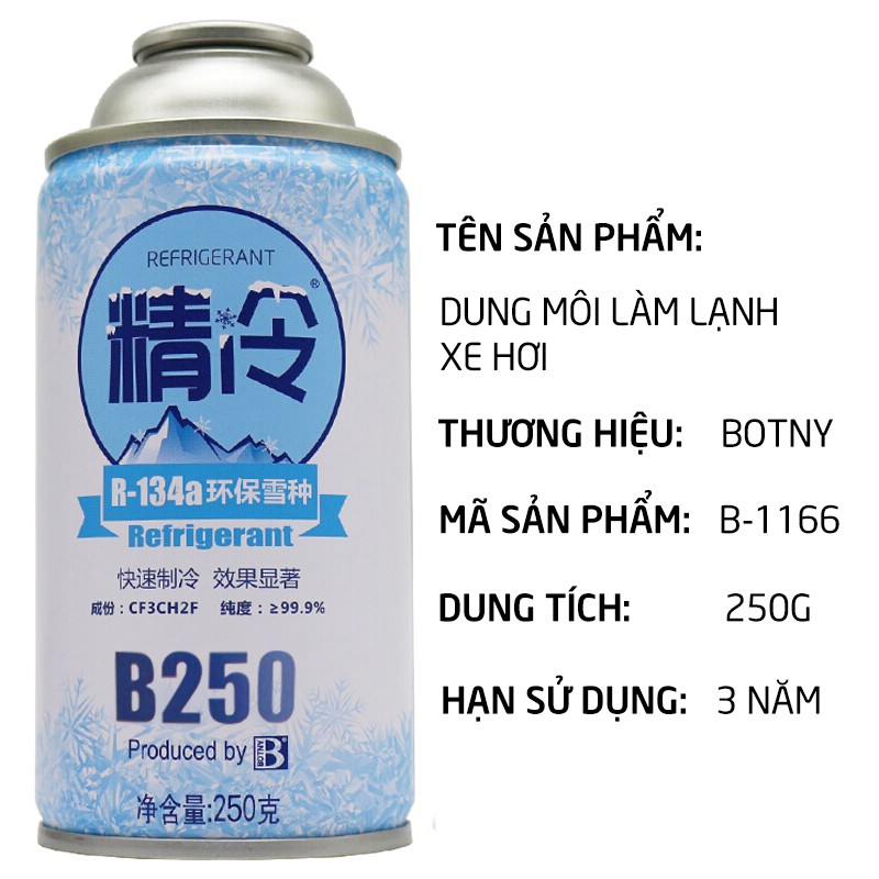 Giới thiệu sản phẩm: Dung môi làm lạnh BOTNY Refrigerant 250g, chất làm lạnh đặc biệt cho máy điều hòa trên ô tô, khí gas làm lạnh chuyên dụng cho xe hơi, xe tải_B-1166