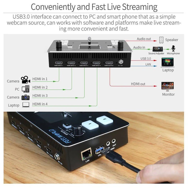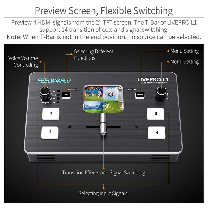 FeelWorld LIVEPRO L1 - Video Mixer Switcher - Bảo hành 12 tháng- Bộ chuyển đổi video với bốn đầu vào HDMI và một đầu ra HDMI