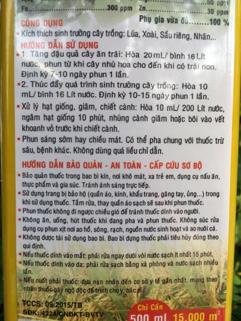 Tăng đậu quả cây ăn trái: Hòa 5-10 ml/ bình 8-10 lít nước, phun từ khi cây nhú hoa cho đến khi có trái non. Định kỳ 7-10 ngày phun 1 lần
