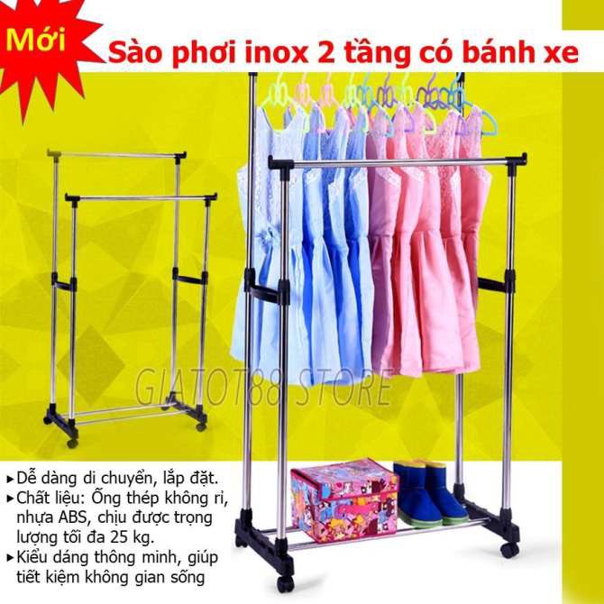 Giàn Phơi Quần Áo Lắp Ráp 2 tầng Inox thiết kế kiểu đôi, giúp bạn phơi/treo nhiều quần áo hơn nhưng có thể thu nhỏ hơn tiết kiệm diện tích. Sản phẩm sau khi lắp đặt sẽ có cấu trúc gồm 2 thanh phơi được thiết kế song song trên dưới, giúp quần áo khô nhanh chóng. Dưới chân có 2 thanh chắn song song để bạn có thể kết hợp phơi giày, dép.Giàn Phơi Quần Áo Lắp Ráp 2 tầng Inox làm bằng chất liệu inox cao cấp không gỉ sét, có thể bảo vệ quần áo của bạn không bị hư do chất gỉ tạo nên. Chất liệu: các thanh được làm bằng inox chắc chắn; dày 0.35mm;. 2 thanh đế ngang ống inox vuông 30x30; dày 0.7mm chịu được khối lượng lớn; các khớp và bánh xe bằng nhựa cao cấp, 4 bánh xe chắc chắn giúp bạn có thể di chuyển kệ phơi đồ này đến bất cứ nơi nào bạn muốn