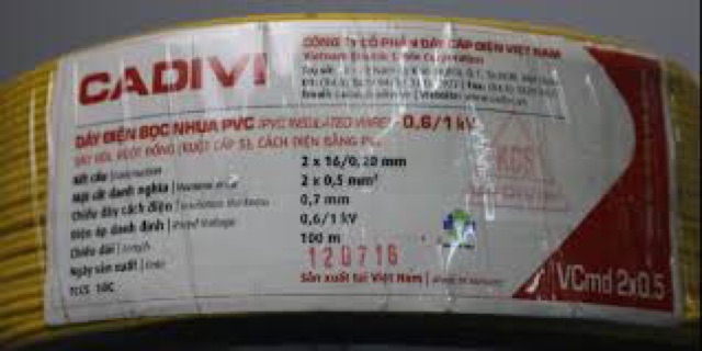 1. DÂY ĐIỆN ĐÔI 2X0.5 MM2 CADIVI có thiết diện 2X0.5 mm2, hoạt động ở điện áp 0.6/1KV, dây dài 100m/cuộn.