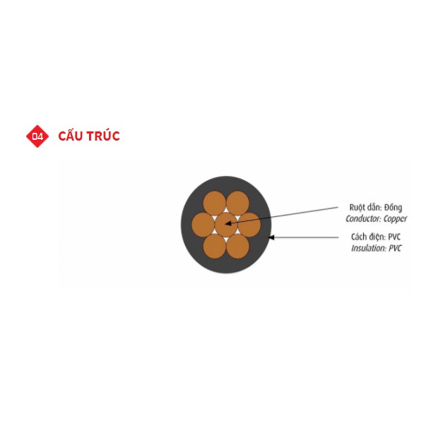 Sản phẩm có một lớp lõi đồng bên trong thực hiện chức năng dẫn điện tốt, lớp vỏ bọc bên ngoài bằng nhựa PVC cao cấp.