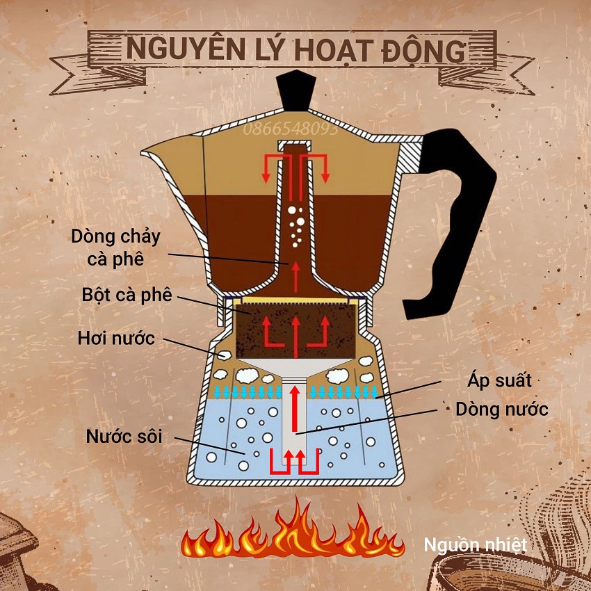 ☑ Với ấm pha cà phê Moka hoạt động trên nguyên lý bằng cột áp suất đẩy.