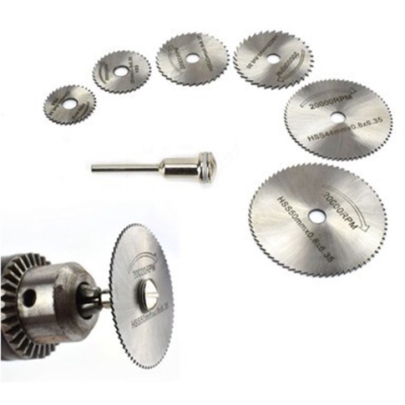 _ Bộ sản phẩm bao gồm 1 trục cán liên kết đường kính 3mm và 6 lưỡi cưa với các quy cách: 22/25/32/35/44/50mm