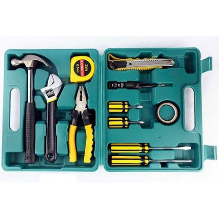 - Một bộ sản phẩm bao gồm: 1 chiếc búa( 25cm), 1 chiếc cờ lê ( 20 cm), 1 chiếc kềm( 17,5 cm), 1 dao rọc giấy cỡ lớn( 16 cm), 1 vít thử điện( 13 cm), 1 vít bake mini( 8,5 cm), 1 vít đầu bằng mini( 8,5 cm), 1 vít bake( 19 cm), 1 vít đầu bằng( 19 cm), 1 cuộn băng keo đen dán điện, 1 thước kéo 2m