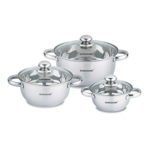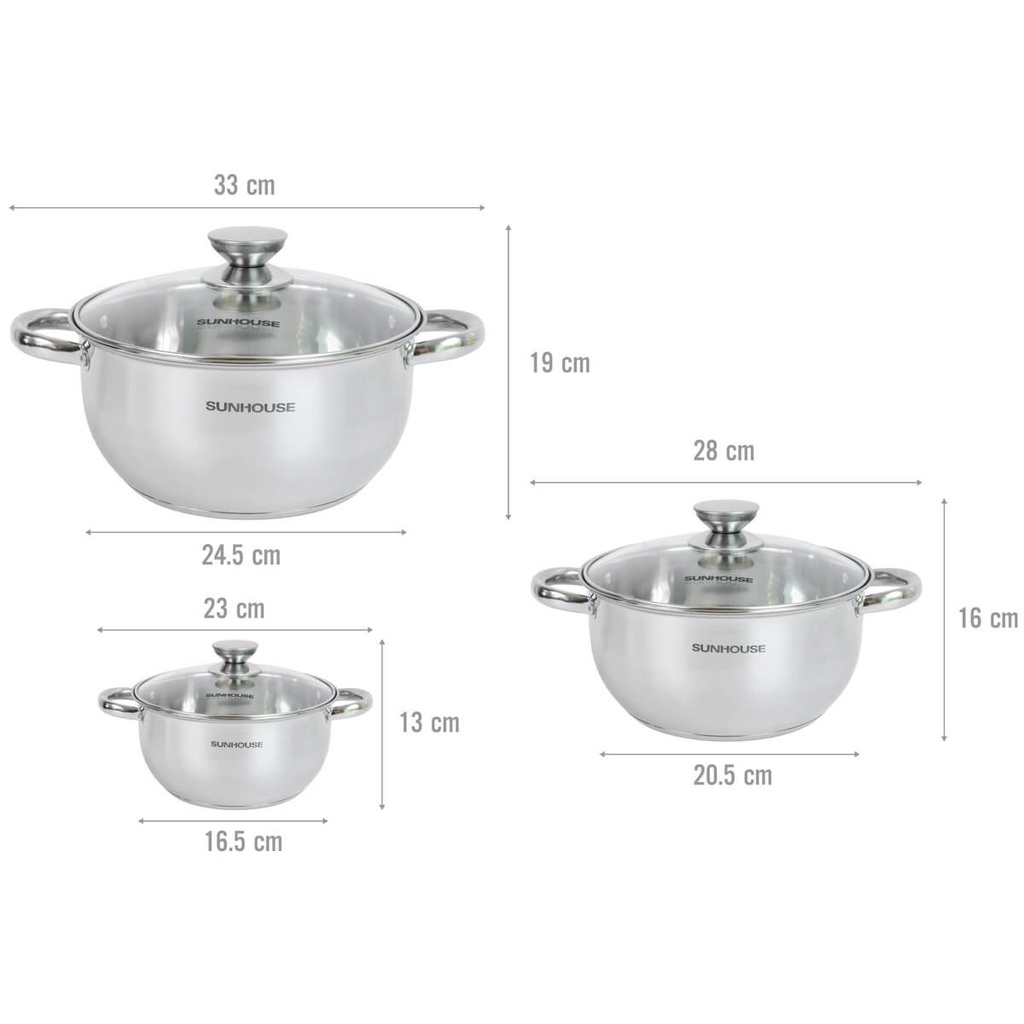Bộ Nồi Inox 3 Đáy Vung Kính Và Vung inox Sunhouse SH334 gồm 03 nồi với đường kính 16 - 20 - 24cm giúp bạn sử dụng linh hoạt để chế biến những món ăn thơm ngon và bổ dưỡng cho gia đình.