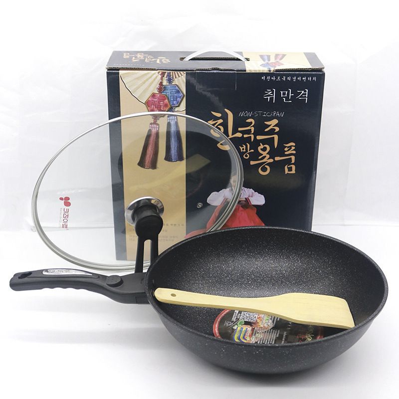 Sản phẩm chảo đá chống dính có nắp đậy thuỷ tinh, xuất xứ Hàn Quốc, có tặng kèm thìa gỗ.