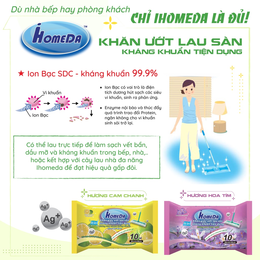 🌈 1 gói khăn ướt lau sàn kháng khuẩn cao cấp iHomeda hương hoa tím (10 miếng) 36k/gói