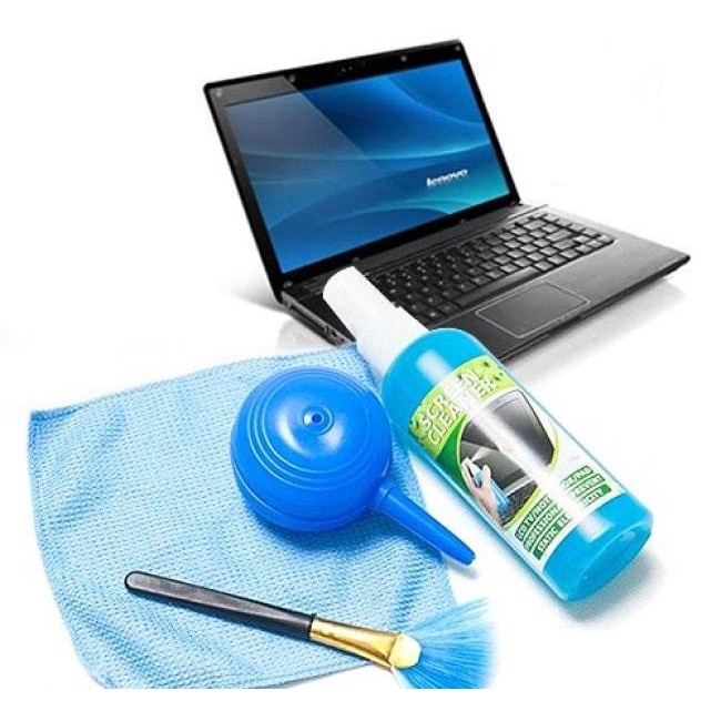 Bộ vệ sinh laptop bao gồm: Cọ, khăn lau chuyên dụng, dụng cụ thổi bụi, nước rửa màn hình