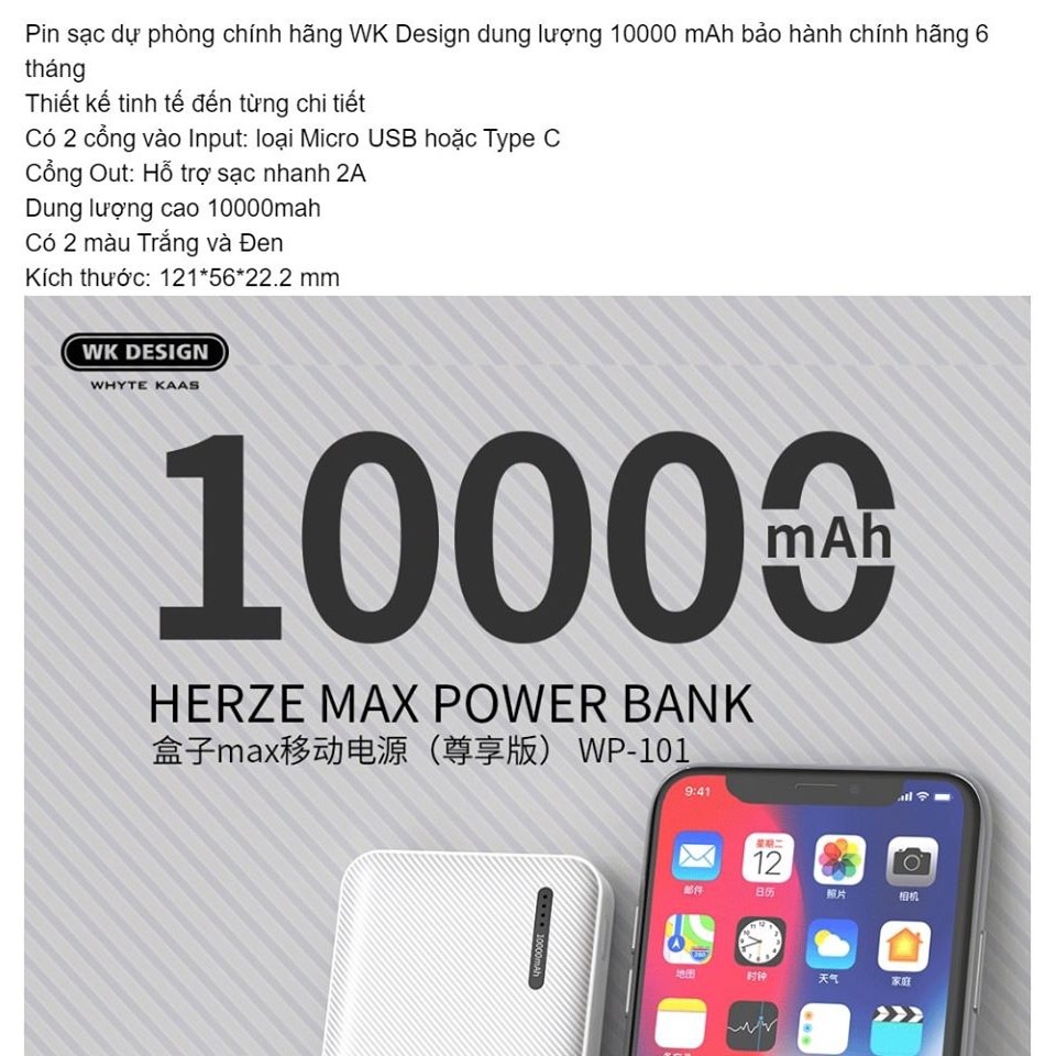 Sạc dự phòng WP-101 10000mAh- sản phẩm chính hãng của hãng WKDung lượng chuẩn