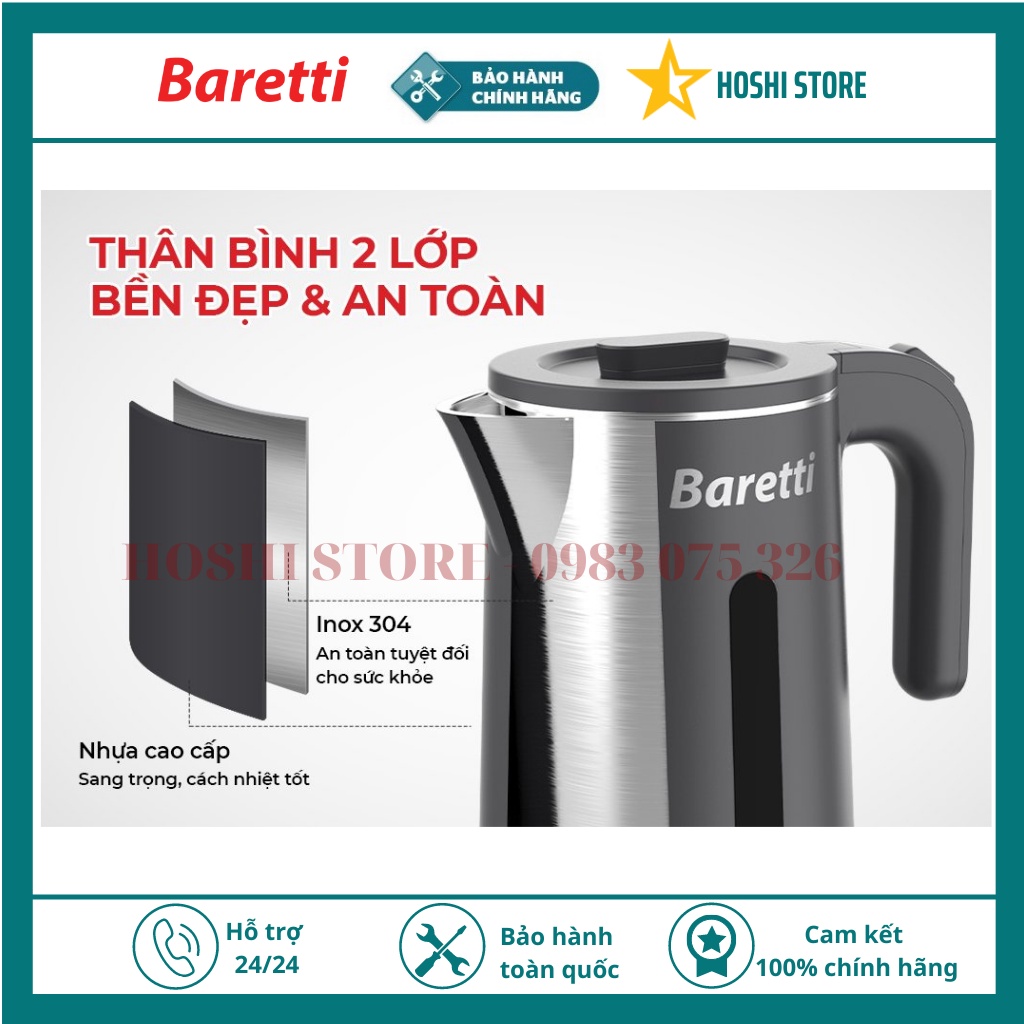 {HÀNG MỚI VỀ} Ấm siêu tốc. Bình đun siêu tốc inox 2 lớp BRD182 Baretti 1.8L màu đen siêu sang