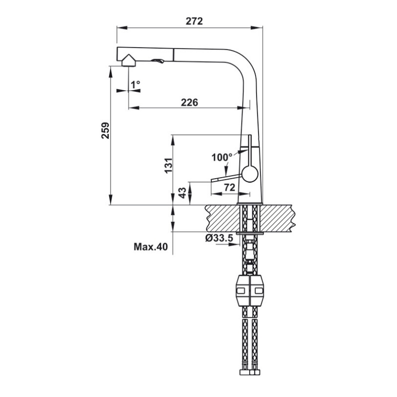 Đầu và thân vòi kết nối với nhau bằng dây rút. Phần dây dài tầm 1m, chịu được nhiệt độ cao. Bạn có thể rút ra để sử dụng dễ dàng khi cần vệ sinh chậu rửa.