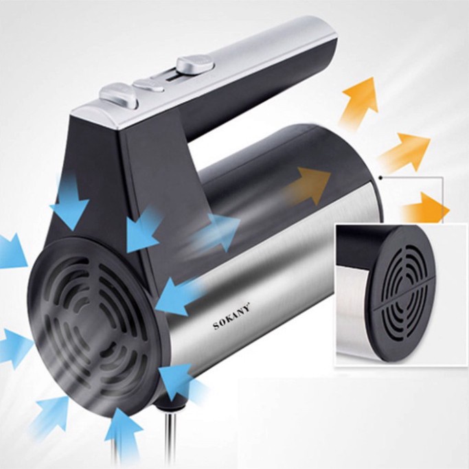 - Máy đánh trứng để bàn Sokany có 2 que đánh trứng, 2 thanh trộn ( đánh bông ) bằng Inox không gây rỉ sét, dùng để đánh kem, đánh trứng, nhào bột và các loại thực phẩm khác đảm bảo chất lượng, vệ sinh.
