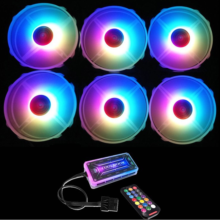 - Sản phẩm bao gồm: 05 Quạt Coolmoon Dualring RGB, 01 HUB (có thể lắp tối đa 10 Fan), 01 Điều khiển màu sắc từ xa, bộ đủ ốc bắt Fan.