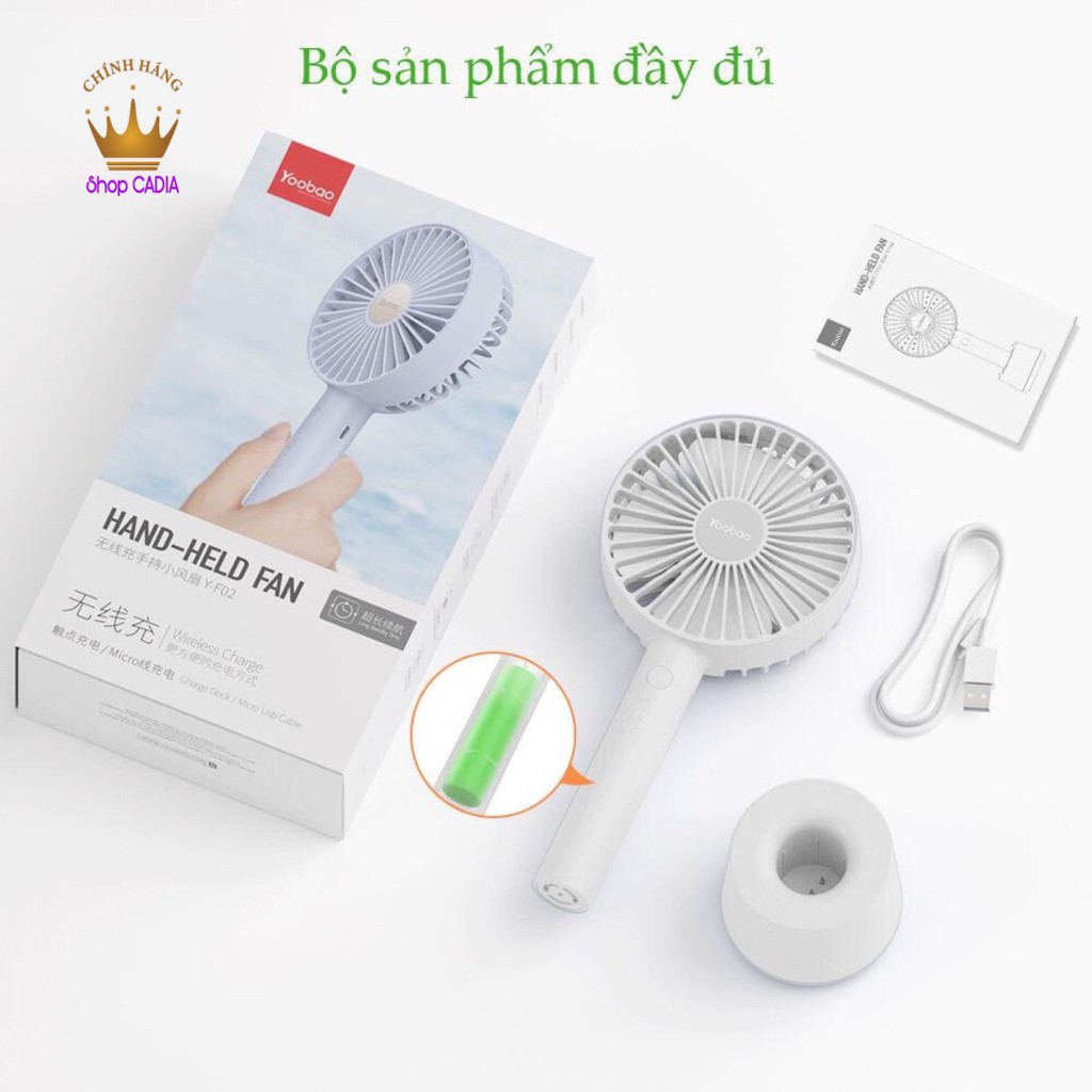 + Đóng gói: 1 x Quạt sạc mini cầm tay Yoobao F02, 1 x Đế cắm, 1 x Cáp sạc micro USB, 1 x Hướng dẫn sử dụng