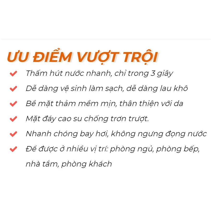 ✔️ Đặt thảm trên bề mặt bằng phẳng ở cửa ra vào phòng tắm. Thảm siêu thấm silicon cho cảm giác khô thoáng ngay khi đặt chân