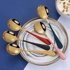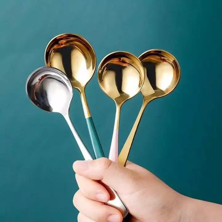 ✔️ Thìa Inox Mạ Vàng Cán Dài Nhiều Màu Với thiết kế tròn, rộng phù hợp khuôn miệng, dễ dàng xúc cơm, soup, cháo.