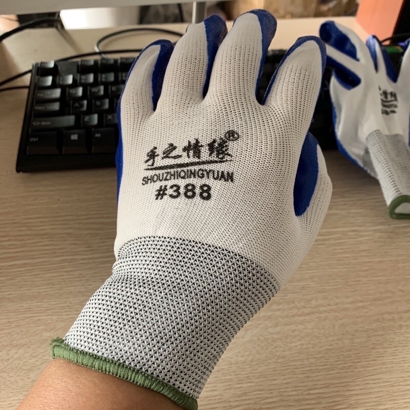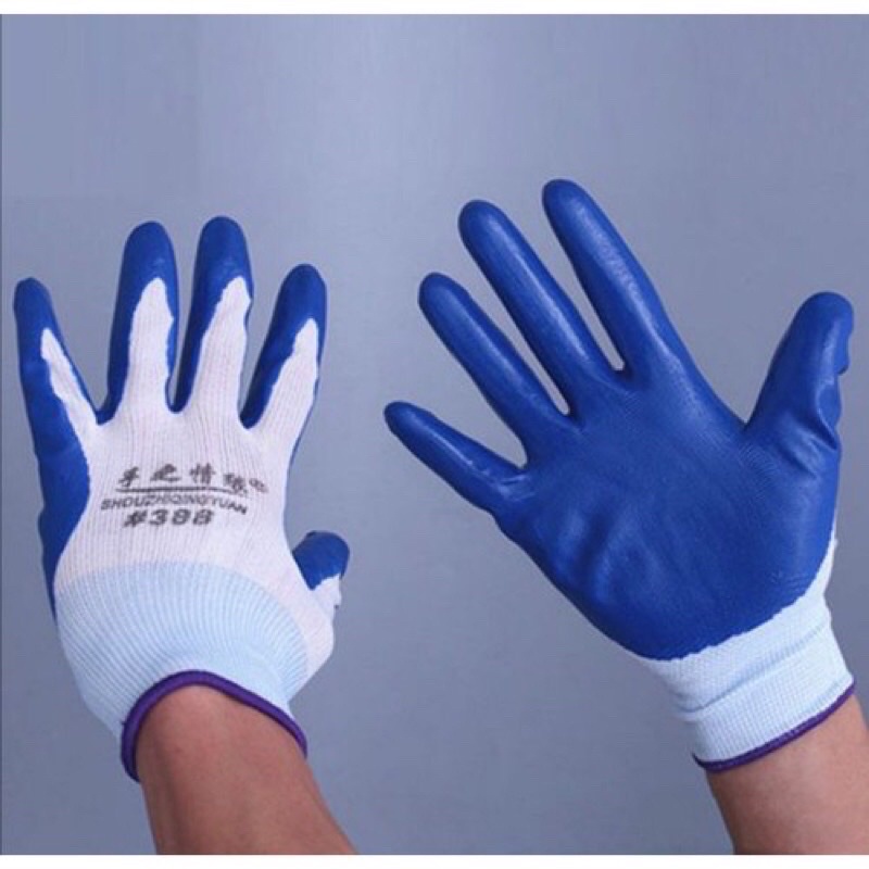 Găng tay bảo hộ lao động phủ sơn xanh, mã 388, được trang bị cho công nhân bốc xếp hàng hoá, xây dựng,…..Găng tay phủ sơn xanh 388 là găng tay bảo hộ lao động
