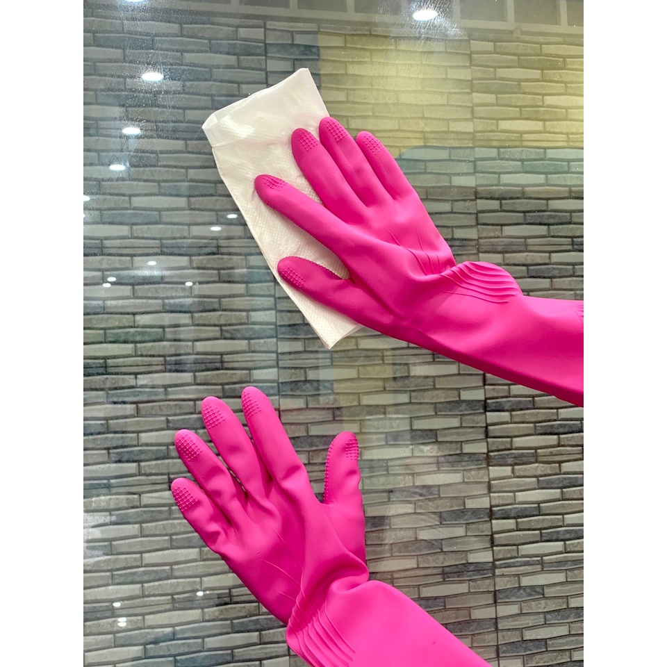 Mặt trên găng tay có thiết kế trơn đẹp mắt cùng mặt tiếp xúc phía dưới có thiết kế gai nhỏ, dày giúp tăng ma sát, giúp bạn không bị trượt tay khi bê, cầm các đồ vật. Chiều dài đến 37cm dài qua khuỷu tay nên rất tiện khi sử dụng. Mùa đông hanh khô, trời lại lạnh nữa, chị em nhớ dùng găng tay cao su khi vệ sinh nhà tắm, rửa bát. Bảo vệ da tay khi tiếp xúc với các chất tẩy rửa, hóa chất gia dụng, nước dơ, các chất bụi bẩn...