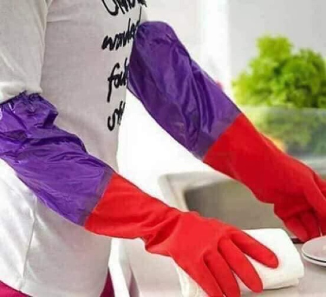 – Phần kéo dài màu tím bằng polyester được bo chun chắc chắn giúp cố định găng tay khi làm việc đồng thời ngăn không cho nước bắn lên tay áo.