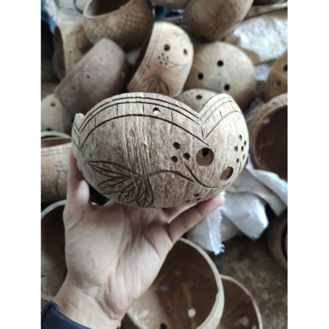 Gáo dừa trồng lan size lớn 13-14cm đường kính trở lên, loại gáo cắt hoa 5 cánh .Có khoan lỗ thoát nước, cắt họa tiết hoa lá cành, khoan lỗ để treo chậu.