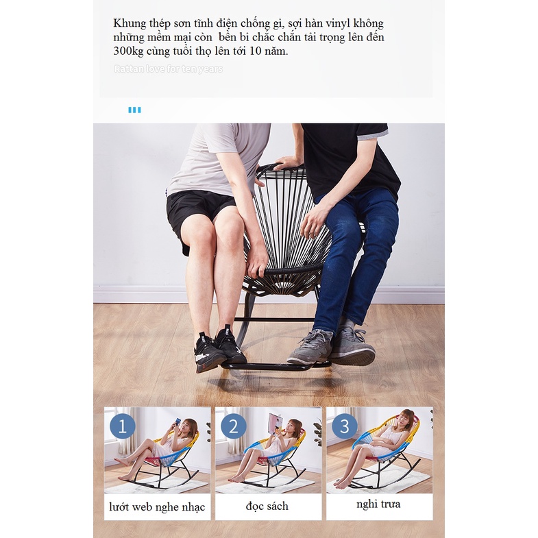 Nếu bạn đang tìm kiếm một chiếc ghế dùng thư giãn đọc sách thoải mái thanh lịch êm ái và không kém phần sang trọng thì chiếc ghế bập bênh thư giãn sợi VINYL là một lựa chọn sáng giá dành cho bạn. ghế được thiết kệ phục vụ cho những người trẻ tuổi và đặc biết đối với các bạn trẻ sẽ mê mẫn chiếc ghế này khi lần ngồi đầu tiên.Khung ghế được thiết kế bằng inox sơn tĩnh điện vô cùng chắc chắn chịu tải lên đến 300kg thiết kế dạng oval tạo sự thoải mái nhất cho người sử dụng kết hợp với dây hàn Vinyl bền bỉ chịu nắng chịu nước tạo nên sự tinh tế và cảm giác thoải mái khi ngồi.