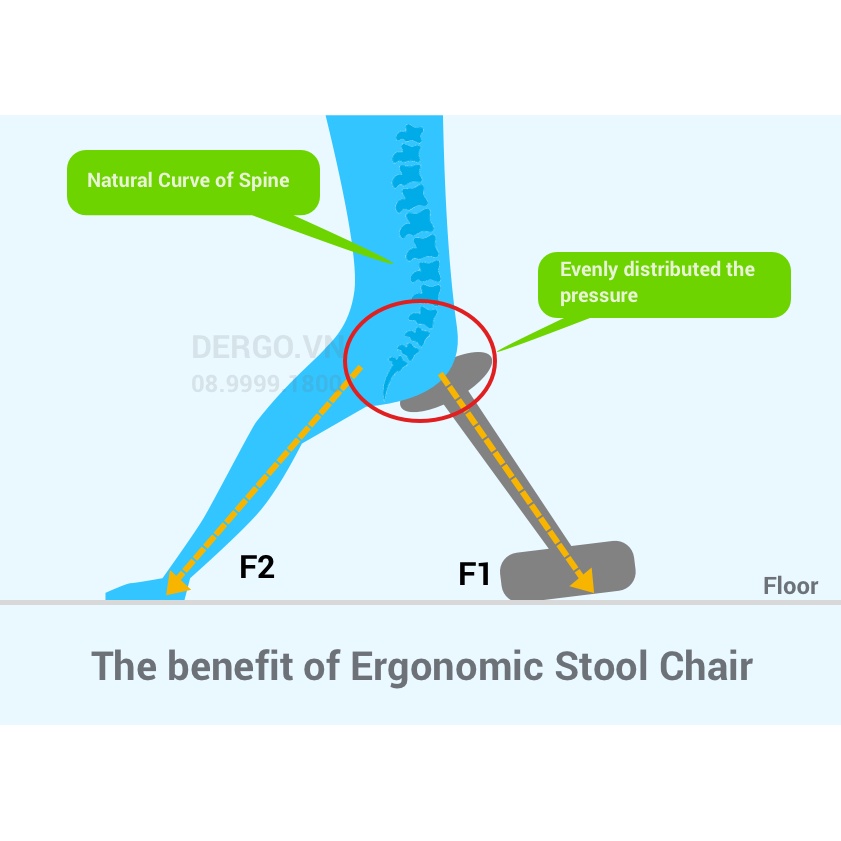 Đối với một chiếc Ergonomic Stool Chair, trọng lượng cơ thế sẽ được chia đều giữa phần xương chậu và hai chân. Bởi khi ngồi ghế có xu hướng nghiêng ra phía trước, kết hợp với hai chân tạo thành một chạc 3 để trụ vững thân thể.