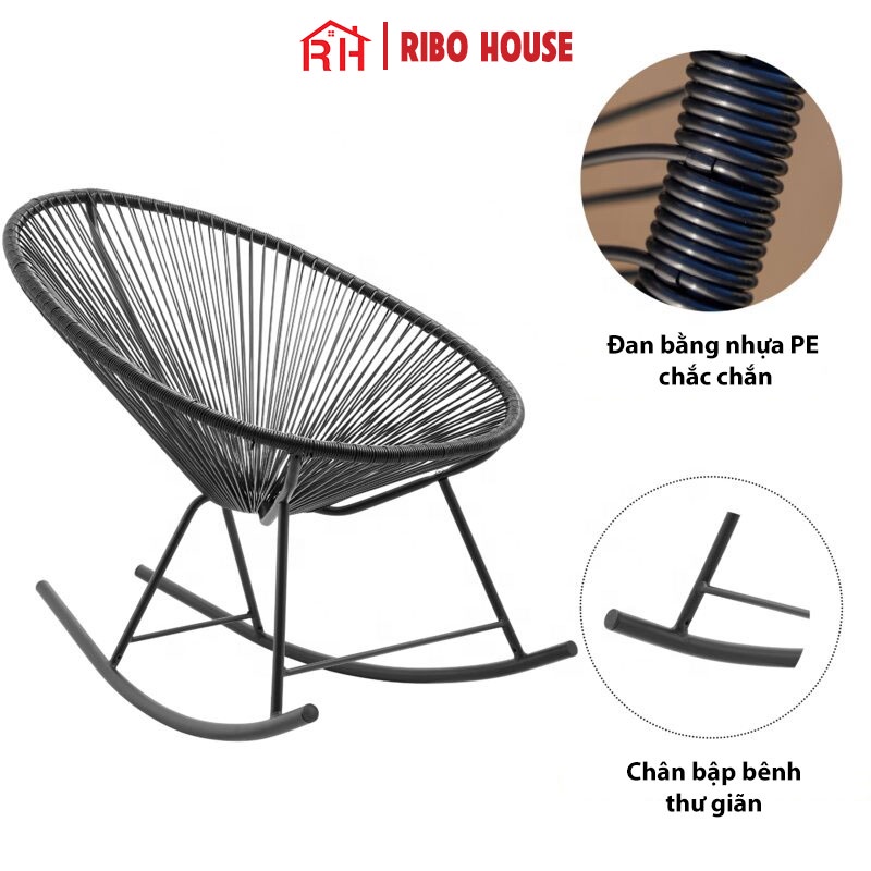 - Chất liệu ghế bập bênh: Khung kim loại sơn tĩnh điện - Dây nhựa đan sợi chuẩn xuất khẩu.