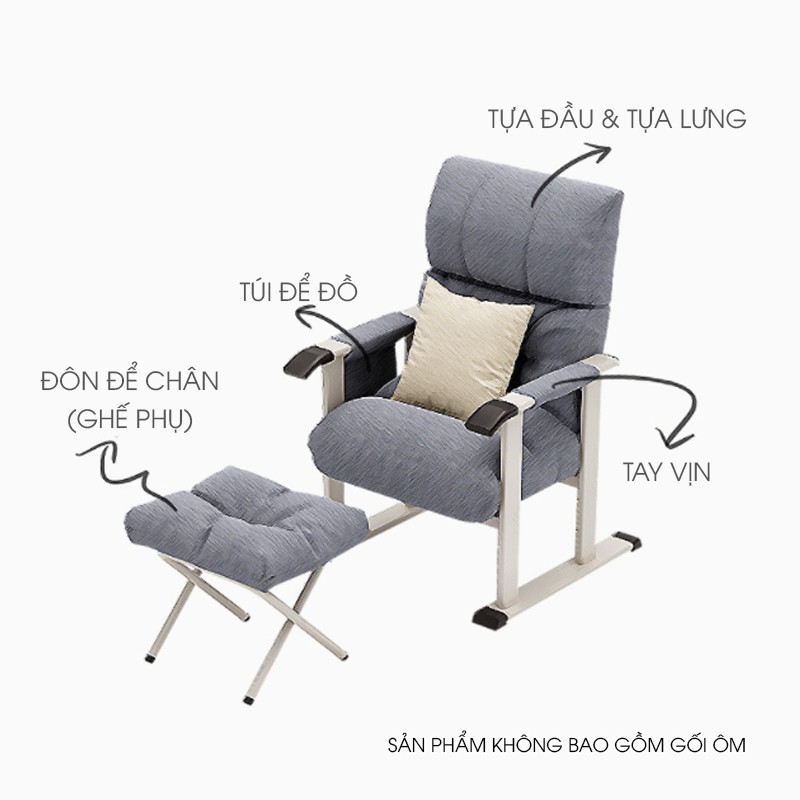 Ghế làm việc đọc sách ngả lưng kèm đôn để chânGhế lười cao cấp đọc sách làm việc thư giãn có thể ngả lưng tặng kèm đôn Kích thước ghế: 60 x 97 x 68 (cm)
