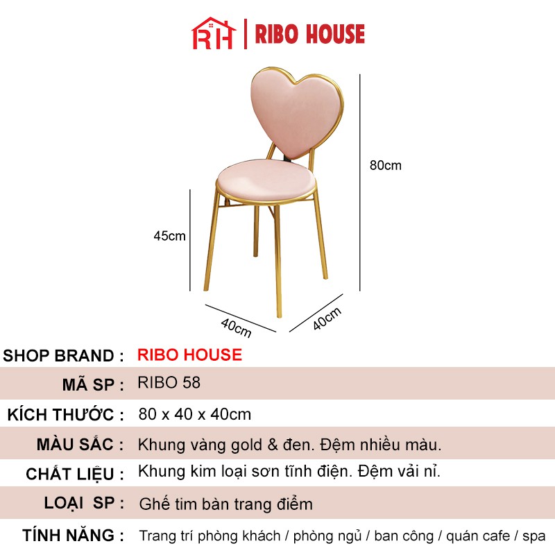 Giới thiệu Ghế tim bàn trang điểm RIBO HOUSE bọc đệm, ghế trang trí phòng khách tiệm nails spa quáncà phê RIBO60