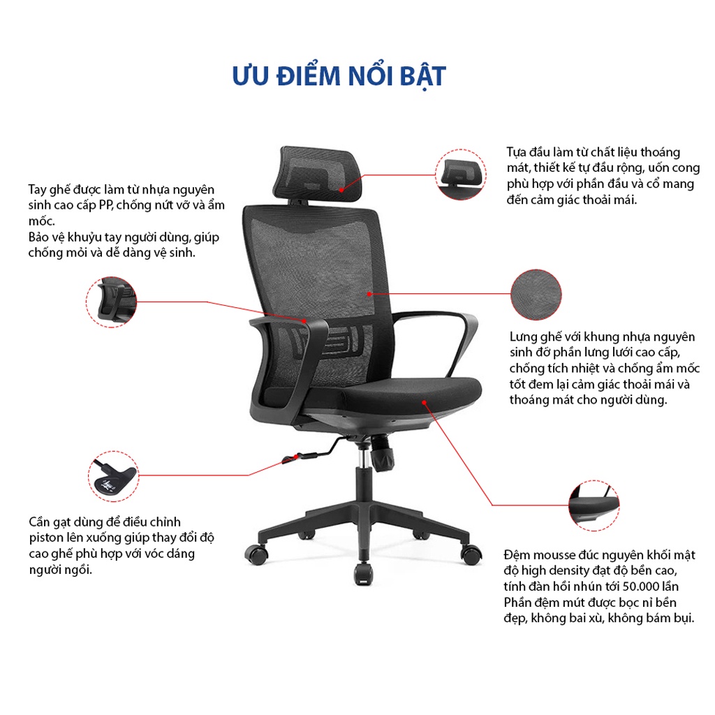 + Tựa đầu bằng vải lưới thoáng mát, điều chỉnh độ cao, xoay góc phù hợp với người ngồi.