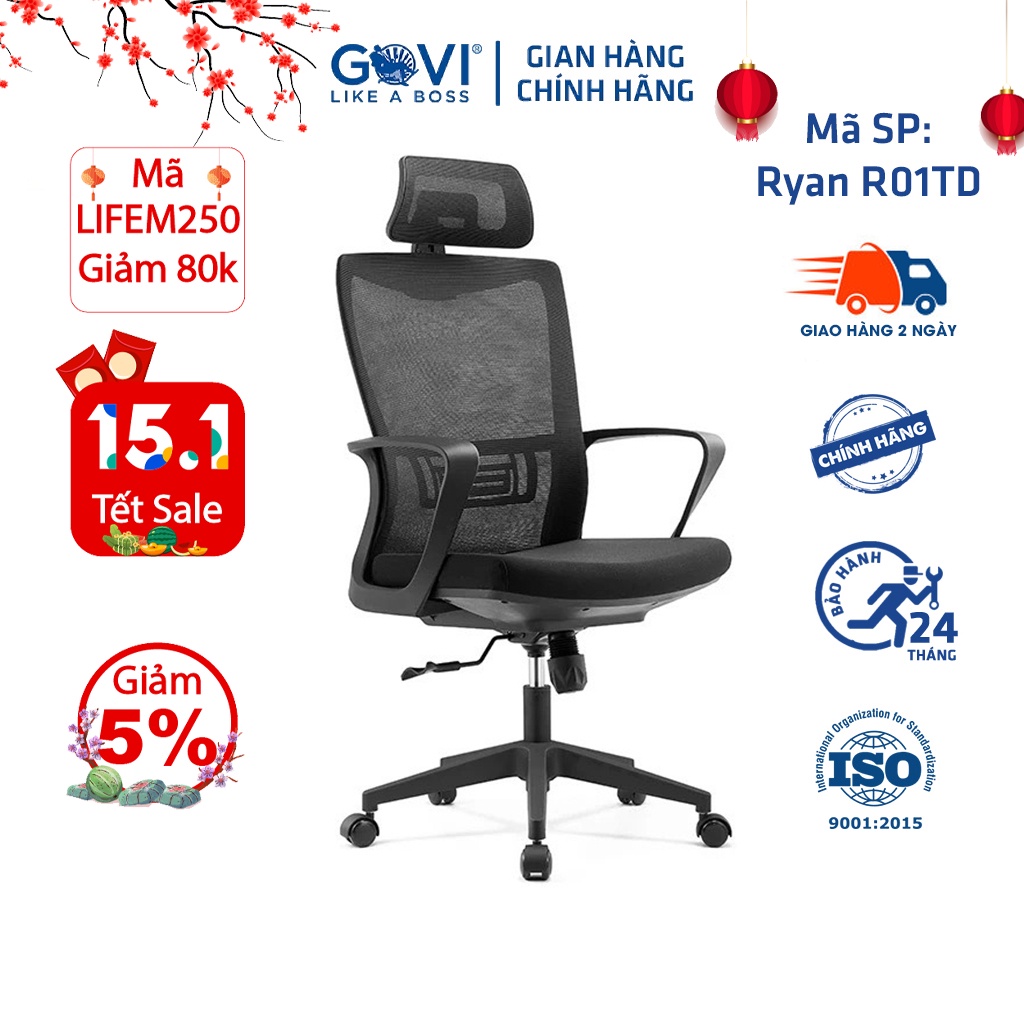 Giới thiệu Ghế công thái học Ergonomic GOVI Ryan R01TD - Tựa đầu điều chỉnh độ cao, tựa tay cố định, mâm ghế ngả sau khóa 1 vị trí