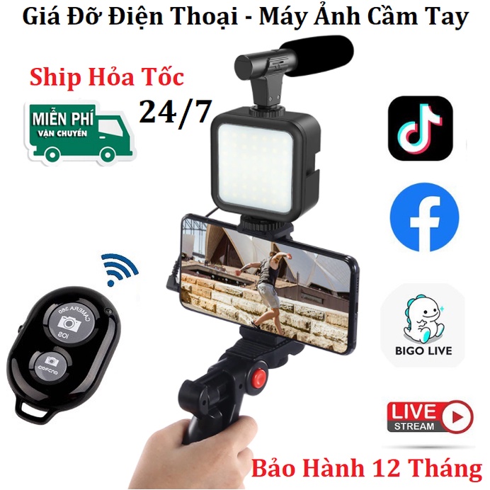 Điện Thoại & Phụ Kiện > Phụ kiện > Phụ kiện selfie > Khác || Giá Đỡ Điện Thoại Cầm Tay Có Đèn - Tích Hợp Mic Thu Âm - Chuyên Quay Video, Tiktok, Vlog, Livestream - Vlog Shot KitCòn hàng