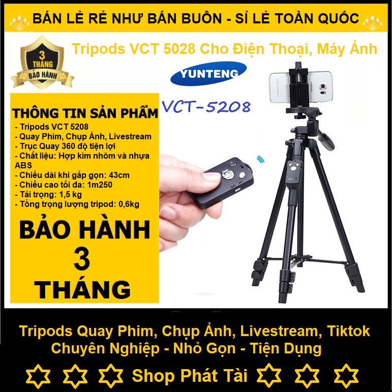 Chân máy ảnh Yunteng VCT 5208 là tripod Cao Cấp được sản xuất dành cho điện thoại và máy ảnh, máy quay cỡ nhỏ, rất chuyên nghiệp-Sử dụng tripod VCT 5208 khi quay phim, chụp ảnh sẽ đem lại hình ảnh rõ nét, không bị mờ - nhòe do rung tay.