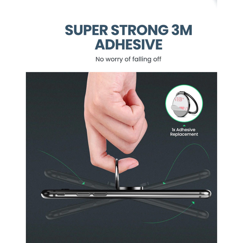 Giá đỡ điện thoại dạng vòng nhẫn đeo tayGiữ điện thoại thông minh của bạn vững chắc, an toàn với đế dán lưng điện thoại chuẩn 3M được nhà máy nhập khẩu