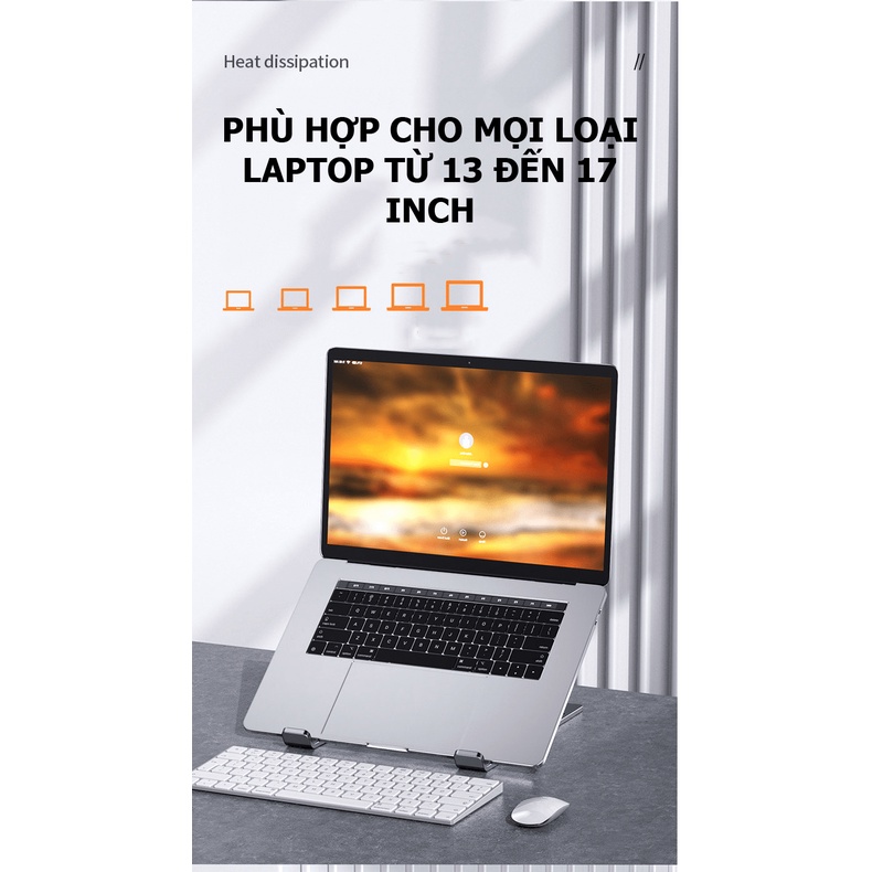 - Giá đỡ máy tính xách tay có thể điều chỉnh độ cao khác nhau, giúp bạn giảm đau vai và thắt lưng, bảo vệ mắt, loại bỏ mỏi tay và thiết kế thông gió để ngăn thiết bị quá nóng.- Chất liệu: Hợp kim nhôm cao cấp siêu cứng cáp, bền bỉ được phủ sơn chống xước, chống gỉ