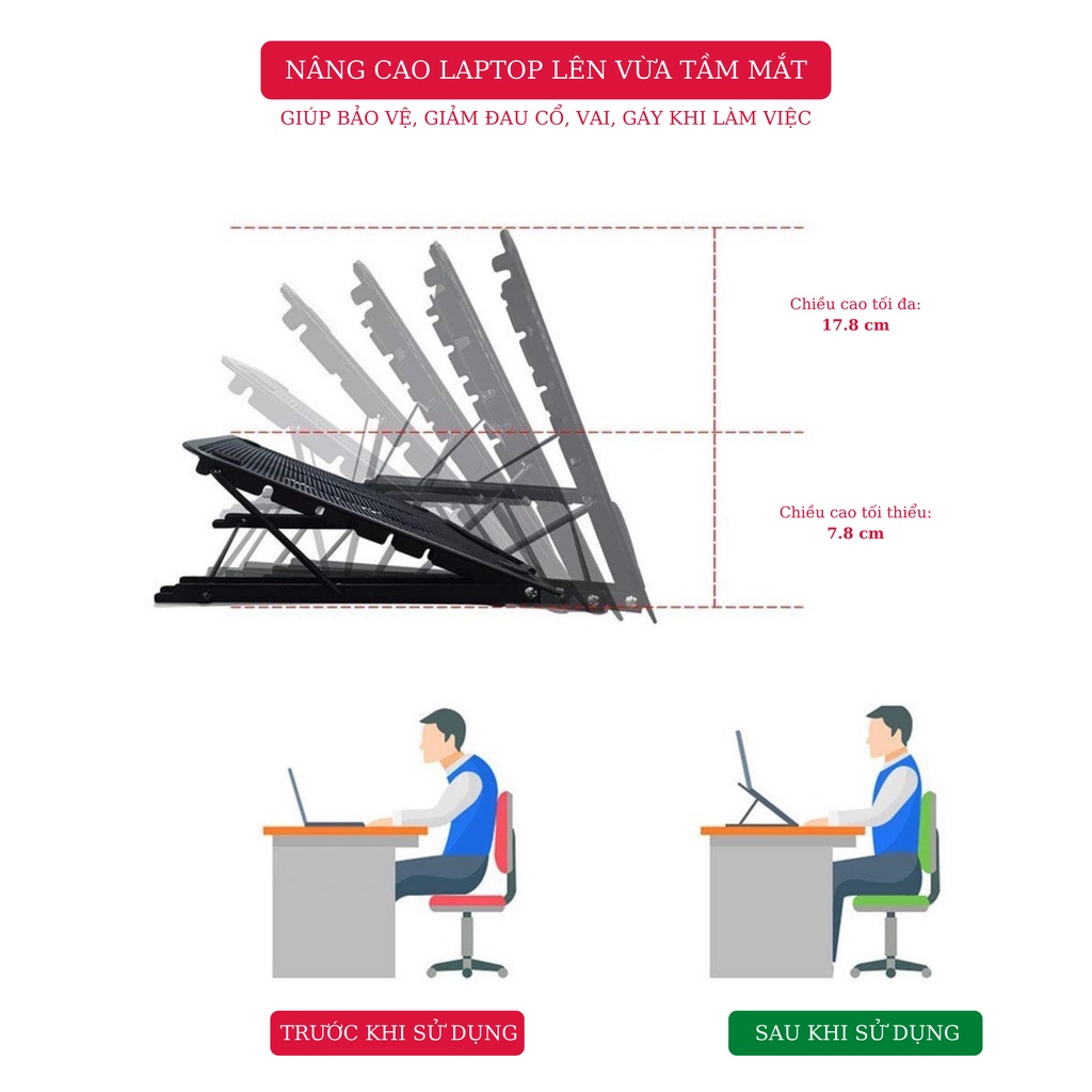 Chất liệu hợp kim nhôm cao cấp sản phậm nhẹ và bền6 góc điều chỉnh khác nhau để thoải mái tối đa khi gõ, đọc và xem, bảo vệ hiệu quả của cột sống cổ.