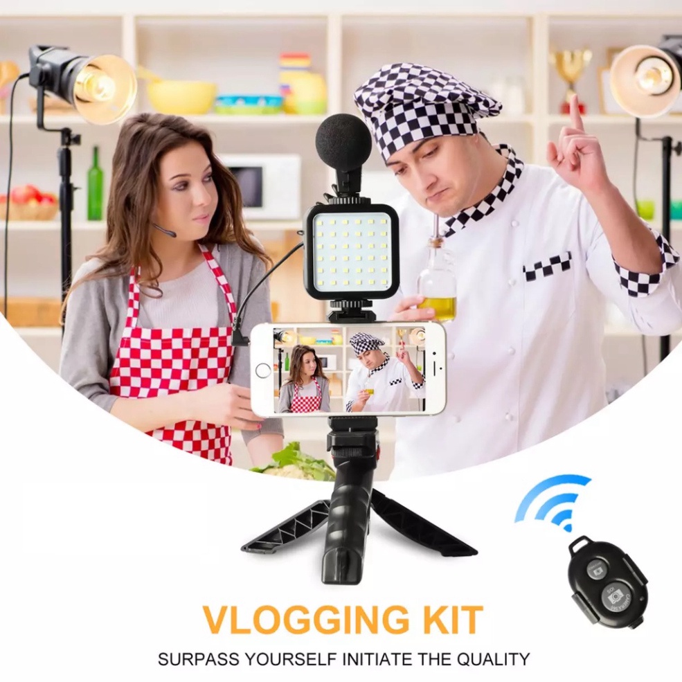 Bộ vlog được thiết kế để nâng cao chất lượng video của bạn với âm thanh và ánh sáng tốt hơn trong nhà hoặc ngoài trời, bao gồm micrô đa năng, đèn LED, tay cầm ba chân, điều khiển từ xa và bộ phụ kiện gắn kết điện thoại thông minh và máy ảnh Bộ dụng cụ có thể được sử dụng trong phát trực tiếp, làm vlog, chụp ảnh chân dung tự chụp và nhiều tình huống áp dụng khác