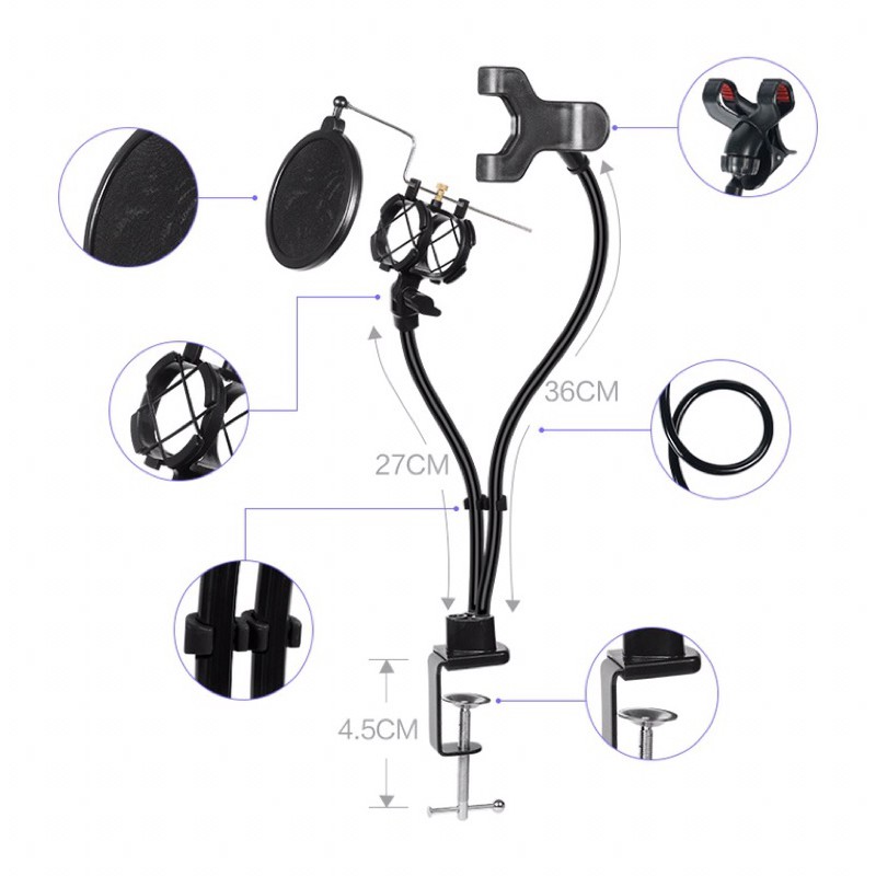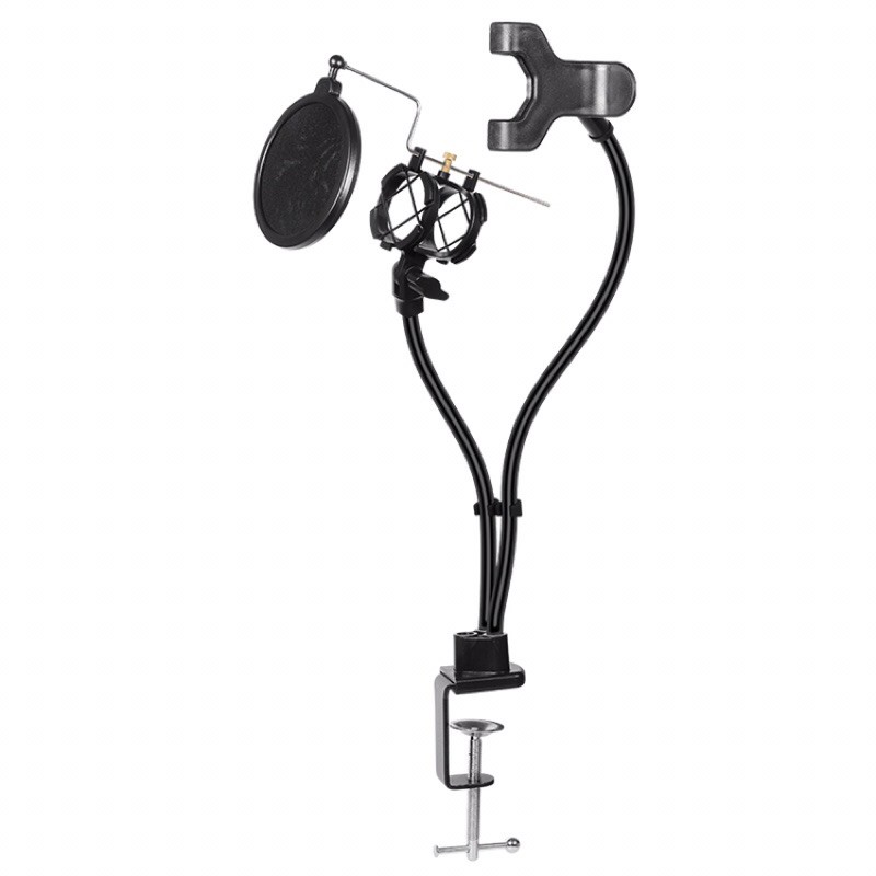 Microphone livestreamVề phần giá treo micro, được thiết kế bằng kim loại với nhiều chốt tùy chỉnh góc đỡ, cùng với các dây lò xo kéo căng, càng tăng thêm phần bền bỉ và tiện dụng. Thêm vào đó là màng lọc âm chuyên dụng, khiến bộ sản phẩm của chúng ta trở nên chuyên nghiệp hơn rất nhiều.