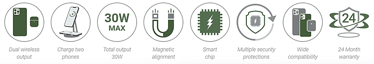 *Lưu ý: Đế sạc phù hợp với các thiết bị có hỗ trợ sạc không dây, riêng chức năng sạc mag.safe chỉ hỗ trợ cho các dòng từ i.phone 12 series trở lên và các dòng tai nghe có hỗ trợ sạc mag.safe. Lực hút từ tính chỉ hỗ trợ tốt khi sử dụng ốp lưng có độ dày <=5mm