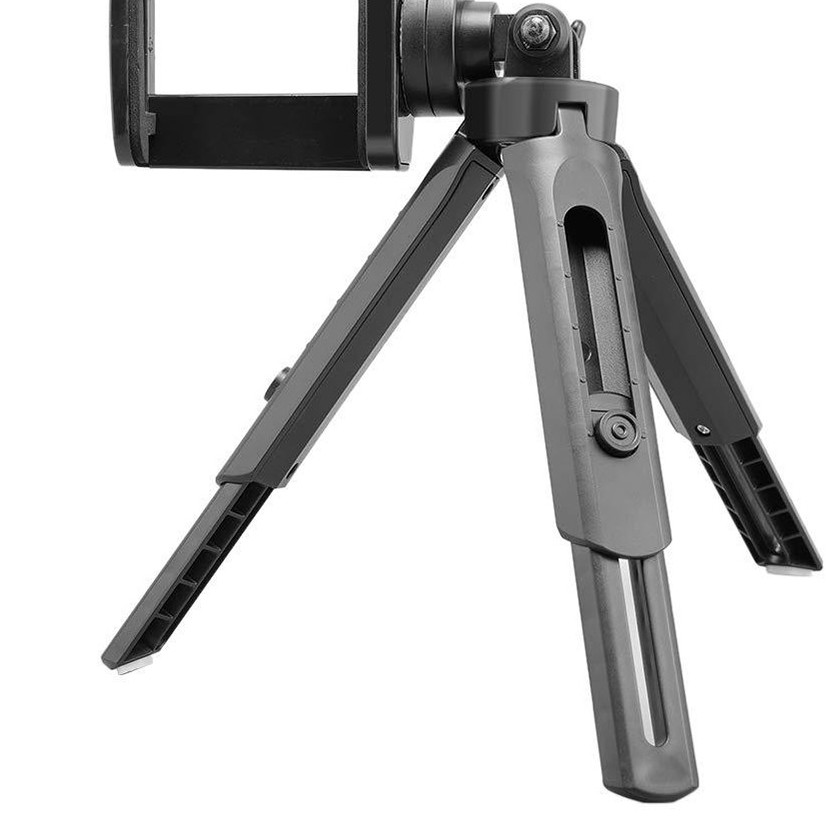 - 3 chân của tripod có thiết kế chống trượt và có thể gấp lại, xòe ra tiện dụng. Tripod có chiều cao tối đa là 13.5 cm (không tính gá kẹp) nhỏ gọn phù hợp đặt trên bàn hay một số vị trí có diện tích nhỏ.