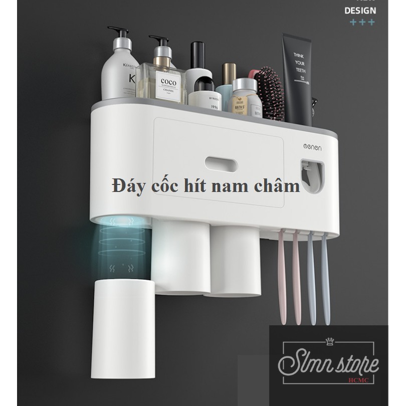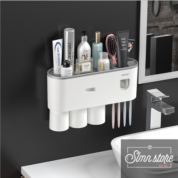 Nhiều công dụng: khe đỡ điện thoại, ngăn đựng kem đánh răng, mỹ phẩm, ngăn kéo nhỏ, 6 khe treo bàn chải đánh răng, ly súc miệng đáy nam châm