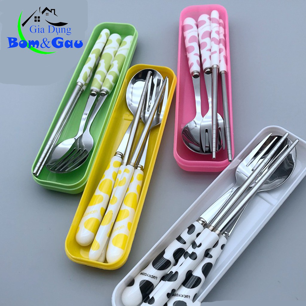 Bộ Đũa Thìa Dĩa INOX 304 kèm hộp đựng tiện lợi du lịch / ăn trưa văn phòng ❤Gia dụng Bom&Gau giới thiệu mọi người bộ đũa thìa dĩa cán sứ cao cấp in hình bò sữa ngộ nghĩnh, chất liệu inox 304 bền, chắc, an toàn sức khỏe.