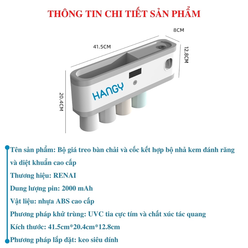 Thông tin chi tiết giá treo bàn chải đánh răng và cốc kết hợp bộ nhả kem đánh răng tiệt trùng bằng tia UV RENAI HANGY:
