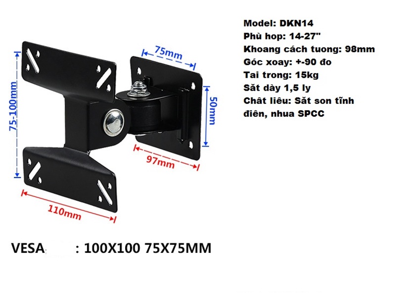 Model: DKN14Thích hợp cho: 14 "-27"Phù hợp với tiêu chuẩn VESA 75mm và 100mm (nghĩa là, mặt sau của màn hình LCD là 75x75mm hoặc 100x100mm phù hợp để sử dụng)Màn hình LCD có thể được điều chỉnh the...- Giao hàng toàn quốc
