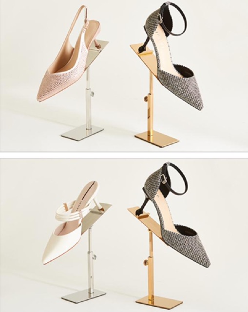 Giá trưng bày giày dép , chuyên dùng cho shop thời trang , giày dép ....Sản phẩm bóng , đẹp & sang trọng , chất liệu titan không rỉ sét , bong tróc , dùng trưng bày giày cả nam lẫn nữ đều được- Có màu inox & vàng hồng