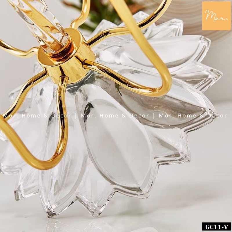 Chân đế được chế tác mô phỏng hình bông hoa úp ngược. Từng cánh hoa pha lê trong suốt khum lại tạo thành bệ đỡ chắc chắn, tôn lên từng đường nét thanh thoát tuyệt vời.