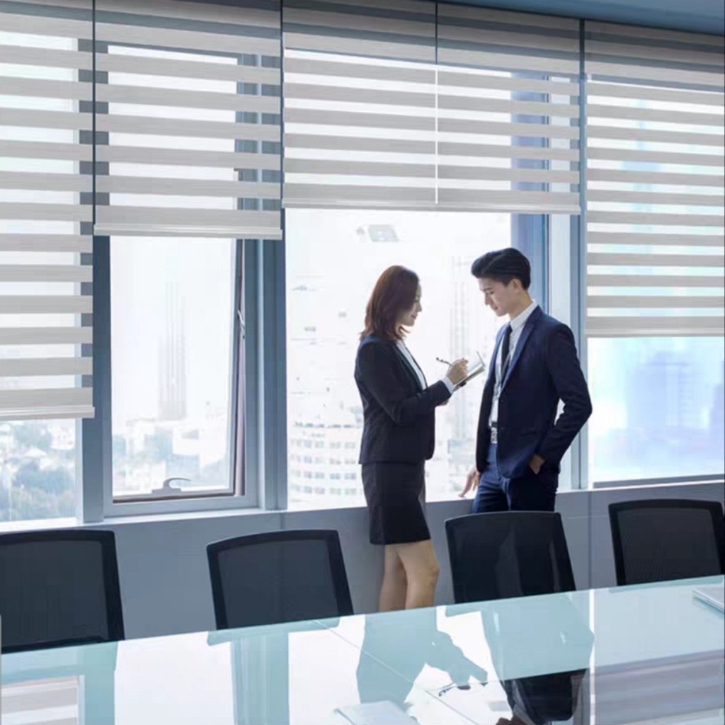 + Chất liệu vải 100% Polyester cản sáng được 70%, cản nhiệt có độ bền cao, không phai màu, chống nhăn, chống nước, chống tia tử ngoại, không bám bẩn và dễ dàng vệ sinh. Hai lớp vải thiết kế song song nhau trên cùng 1 dải có thể điều chỉnh ánh sáng dễ dàng.