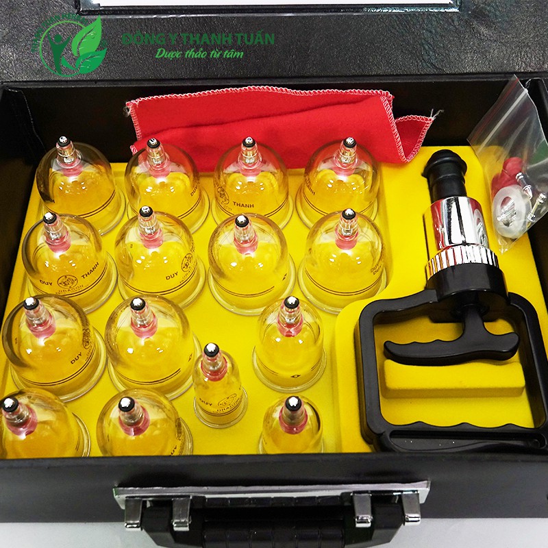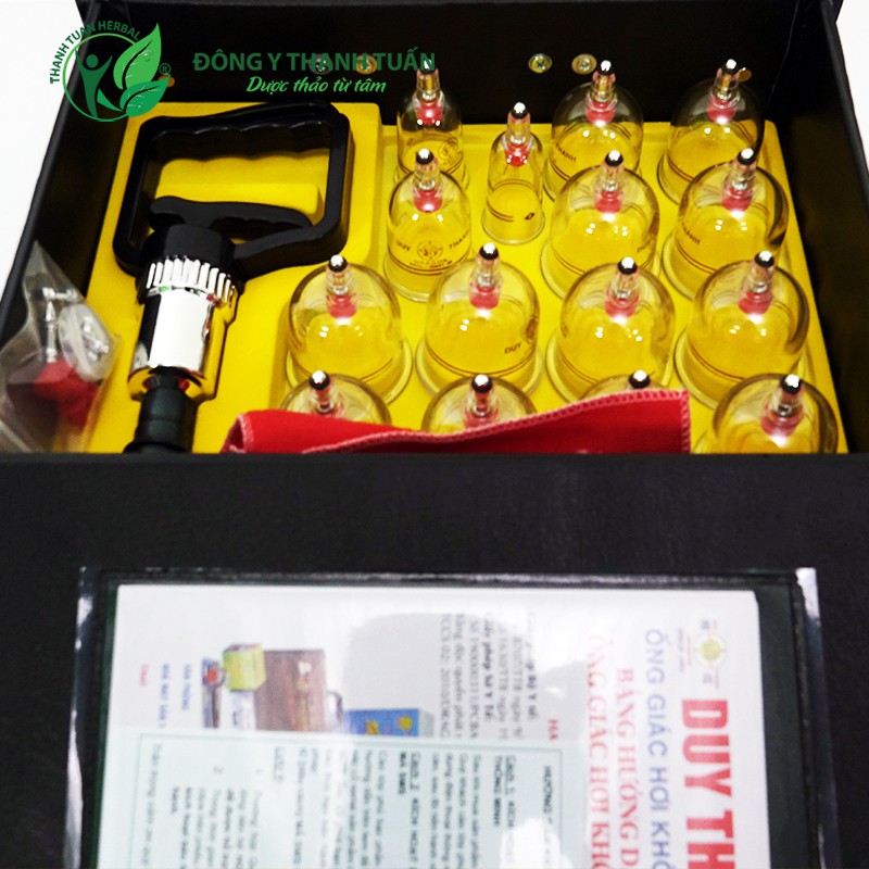 - Bộ sản phẩm gồm: 01 hộp vali màu đen, 01 ống bơm giác hơi, 15 ly giác (12 cốc to, 2 cốc vừa, 1 cốc nhỏ), 01 bịch phụ kiện thay thế, 01 khăn, Tờ hướng dẫn sử dụng (kèm chứng nhận Viện YHDT).